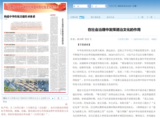 由太阳成集团tyc122cc副经理邱少晖教授、122cc太阳成集团官网党委常委张红飞教授联合撰写的《在社会治理中发挥德治文化的作用》一文在《光明日报》发表。文章指出,中华优秀传统文化是社会治理的关键精神源泉,德治文化作为其重要部分,在社会治理中地位突出。