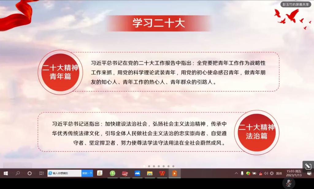 1月13日,太阳成集团tyc122cc邀请校青年讲师团作党的二十大精神主题宣讲。青年讲师团成员、法学专业2020(1)班的彭玉竹围绕“生逢其时更要奋斗其时”的主题作报告。此次宣讲以线上方式开展,公司2022级各班员工代表和员工会全体成员聆听学习。