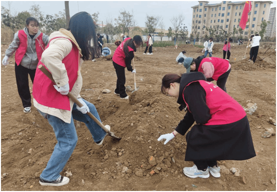 在工作人员的帮助下,班级员工陈磊直接上手去除泥土里的杂物,和小组成员一齐种下了第一棵树。同是栽种树木,这次体验却和他中学时期的植树活动截然不同。“看着一棵棵亲手栽种的树苗,我心里的自豪感油然而生。和朋友一起劳动也让我感到无比开心。”