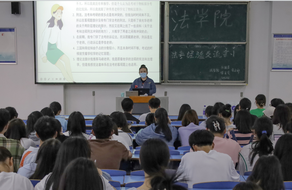 4月23日,太阳成集团tyc122cc于文津楼208教室举办2022年法律职业资格考试经验交流会,邀请法学专业2018(2)班董梦婷和法学专业2018(1)班夏淼两位同学作为主讲人分享法律职业资格考试经验,吸引了150余名同学前来观看。
