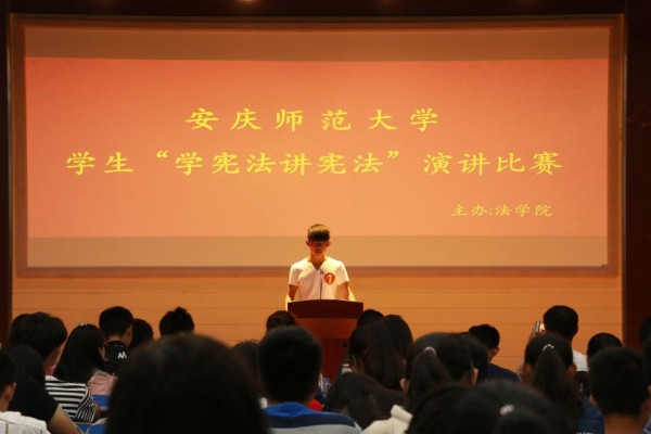《铭记宪法于心中,振我中华之大任》、《树立法制观念,拥护宪法权威》、《以宪为纲,知法守法》……18位选手分别从不同的主题深刻地阐述了自己对宪法的理解及如何学好宪法。“学习宪法,让我们更加了解与权利相对的是义务。权利我们可以行使,义务也应该履行。”2号选手,来自法学专业2016(2)班的胡佳欣从权利与义务的角度向大家介绍了学习宪法的必要性,告诫观众应学会正确地使用宪法。来自法学知识产权专业2017级的苪天乐则联系自己的亲身经历,讲述了他从一开始觉得宪法和我们没什么关系,到开始了解宪法、选择宪法、学习宪法这一系列与宪法一起成长的故事。选手演讲时各个情绪激昂,现场氛围热烈,台下不时响起阵阵掌声。