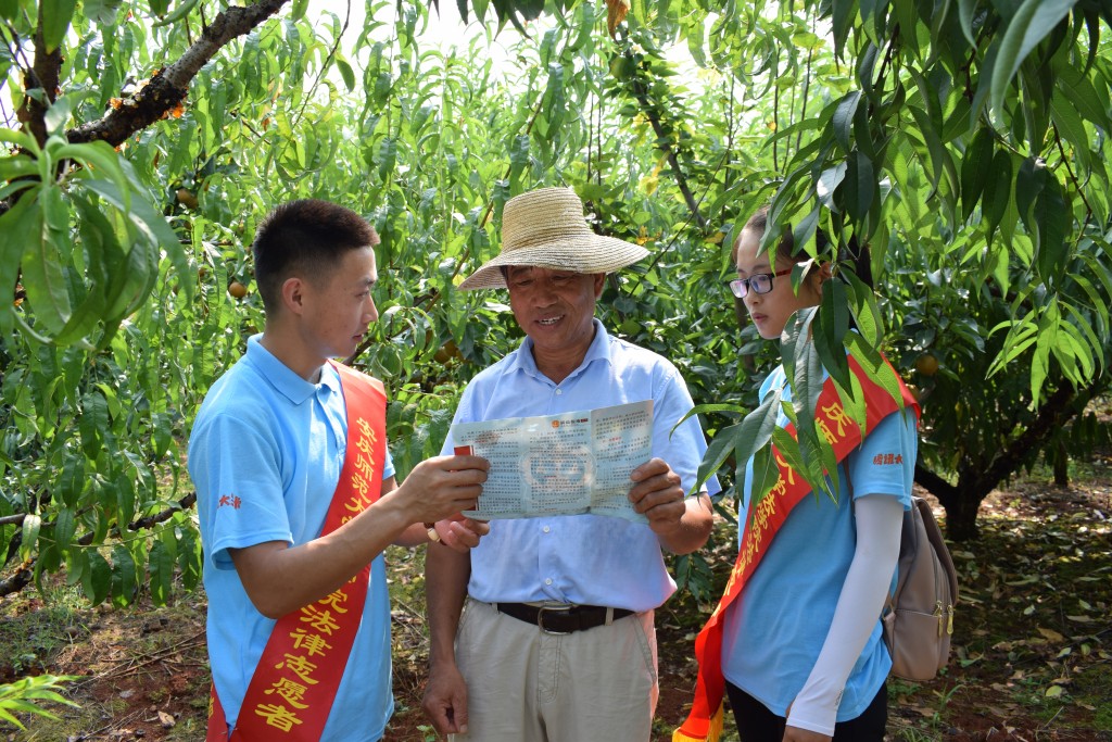 服务队就党的十九大报告中强农惠农政策、《农产品质量安全法》、《农产品市场交易法》及相关配套法律法规向果农们进行深入宣讲,同时,服务队成员向果农们重点介绍了“乡村振兴战略”,并针对他们关心的土地流转、土地承包、土地使用权、惠农政策等法律和政策进行进一步的详细说明和答疑解惑,果农们表示现在越来越感受到了国家对于农业农村农民的高度重视与关心,对今后的美好生活充满了信心。