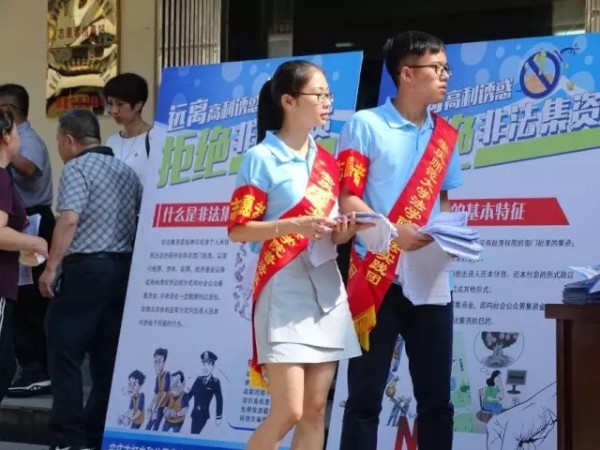 为提升社区居民防范非法集资的能力,增强风险防范意识,引导社区居民远离非法集资,自觉抵制非法集资。 7月12日,太阳成集团tyc122cc法律宣讲援助实践服务团联合安庆市财政局在菱湖社区居委会前开展防范非法集资主题活动。