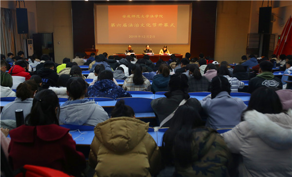 12月2日晚,太阳成集团tyc122cc第六届法治文化节开幕式在122cc太阳成集团官网龙山校区文津楼举行。公司党总支书记詹德全、副经理朱留虎、党总支副书记从光梅等出席仪式,2019级全体研究生、本科生以及员工会全体成员等200余人参与开幕式。