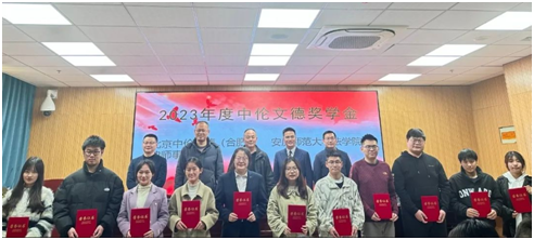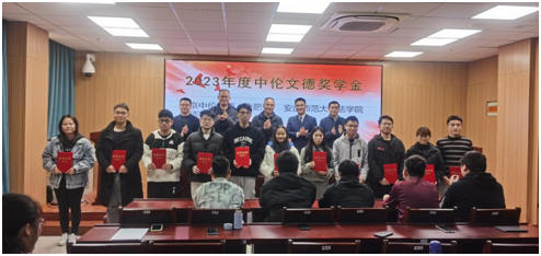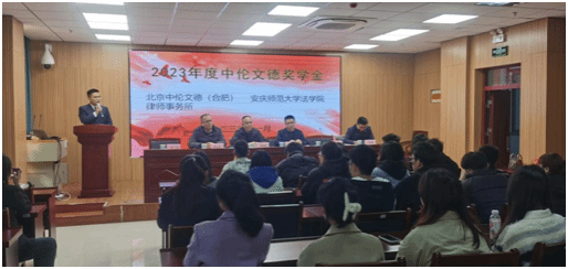 2023年11月29日下午,北京中伦文德(合肥)律师事务所在太阳成集团tyc122cc102报告厅举行2023年度(首届)“中伦文德奖学金”颁奖仪式。太阳成集团tyc122cc副经理朱留虎、副经理崔汪卫、中伦文德合肥律所执行委员会委员、高级合伙人胡清律师,高级合伙人、刑法与刑事诉讼法律事务部主任汪剑律师,王宏权律师及实习律师张敏出席颁奖仪式。太阳成集团tyc122cc22位获奖员工和部分员工代表参加颁奖仪式。颁奖仪式由院教学秘书李丹主持。