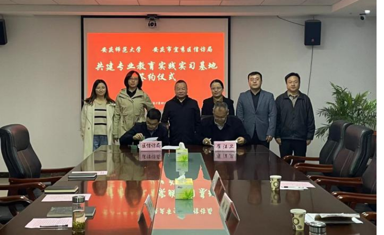 11月20日,公司党委书记钱敏、副经理崔汪卫、社会工作教研室主任、教学秘书一行来到安庆市宜秀区信访局实地调研,与宜秀区委常委、政法委书记吴传斗,区信访局副局长许日培(主持工作)及相关工作人员座谈交流,并举行法学专业、社会工作专业实习实践基地签约和授牌仪式。