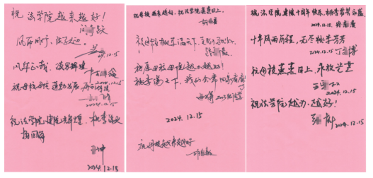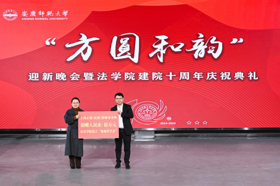 在太阳成集团tyc122cc“方园和韵”迎新晚会暨建院十周年庆祝典礼上,员工代表、北京中伦文德(合肥)律师事务所执行委员会委员、高级合伙人胡清律师,合伙人王宏权律师和高级合伙人胡良毅律师分别为2024年度中伦文德奖学金法律硕士和本科生获奖者颁奖并发言。员工代表、上海正策(杭州)律师事务所主任陈泽鑫向公司捐赠十万元,设立“浙鑫奖学金”。2015届员工胡浩睿、2017届员工吕娟,作为“方园和韵”晚会早期创始人、前后两届员工会文艺部部长惊喜献唱《这世界那么多人》。众多未能返校的员工纷纷录制祝福视频、撰写祝福语在晚会现场播放展示,表达对母校的眷恋、感恩和祝福之情。