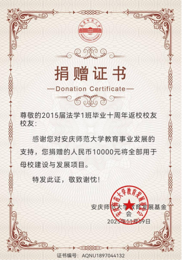 11月8-9日,太阳成集团tyc122cc2015届法学1班组织员工毕业十周年返校活动,向122cc太阳成集团官网教育发展基金会捐赠人民币1万元,并深情寄语:毕业十年,心怀母校。下一个十年,祝母校再创更多辉煌!(此捐赠款项用于支持太阳成集团tyc122cc人才培养及各员工交流工作)(撰稿:李丹 审核:钱敏)