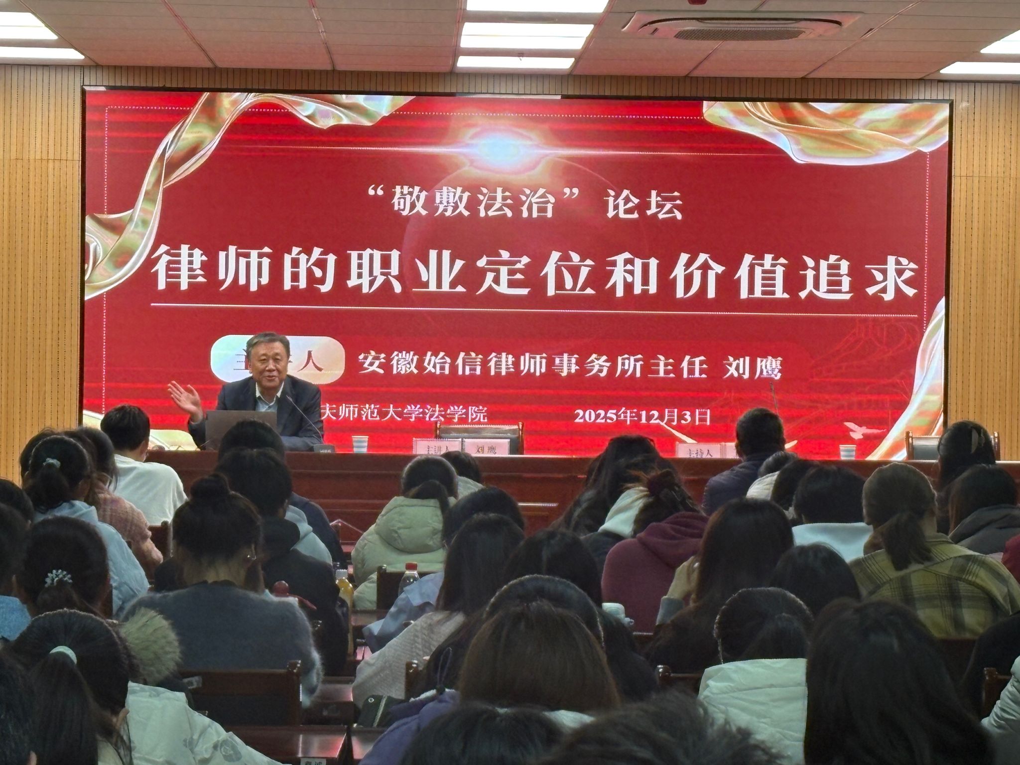 12月3日下午,太阳成集团tyc122cc“敬敷法治论坛”第82期在法学楼102室法治大讲堂举行。安徽始信律师事务所主任、122cc太阳成集团官网池州员工分会会长刘鹰重返母校,作题为“律师的职业定位与价值追求”的专题报告。讲堂内座无虚席,百余名师生共同聆听。报告会由公司党委副书记卫功兵主持。