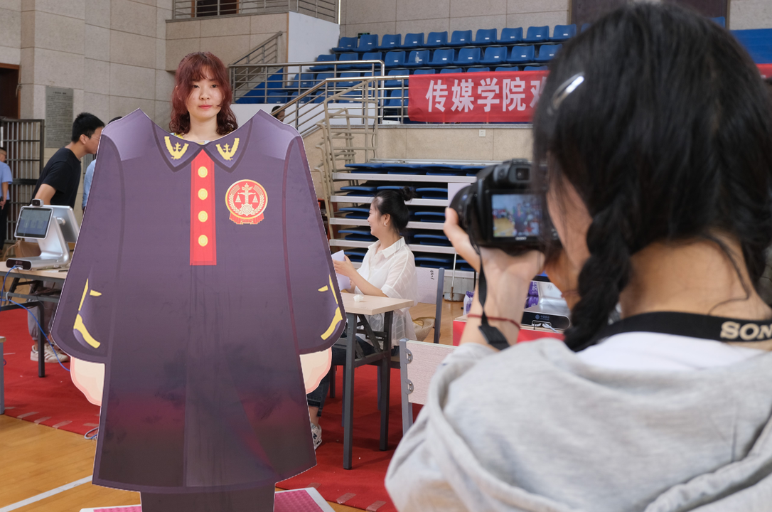 魏邦畅还在“我是大法官”人形拍照板前拍了一张照片。“我是大法官”人形拍照板是今年新设置的环节,新生在报到完成后,可以在头部镂空的卡通形象牌前进行拍照纪念。“这个设计很新奇,做律师一直是我的梦想,拍照留念也算离梦想又近了一步。”魏邦畅说。