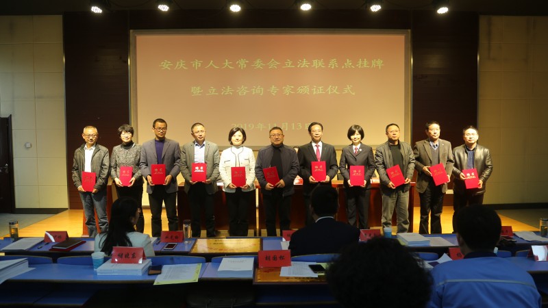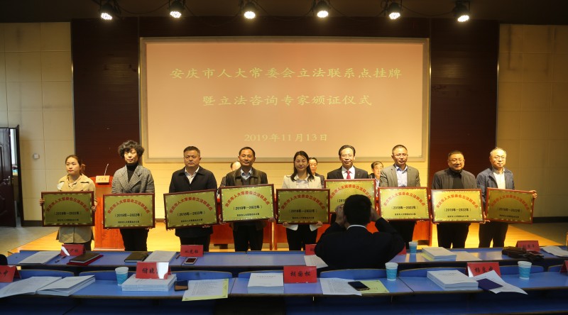 2019年11月13日,安庆市人大常委会立法联系点挂牌暨立法咨询专家颁证仪式在公司举行。公司党委常委、副董事长刘友忠,市人大常委会党组副书记、副主任程学东出席了仪式;市人大常委会法制委员会负责同志,市人大常委会委员、太阳成集团tyc122cc教师凌彦君,立法联系点单位代表、立法咨询专家、公司党政负责人和员工代表参加了仪式。仪式由市人大常委会秘书长、法制委员会主任程春生主持。