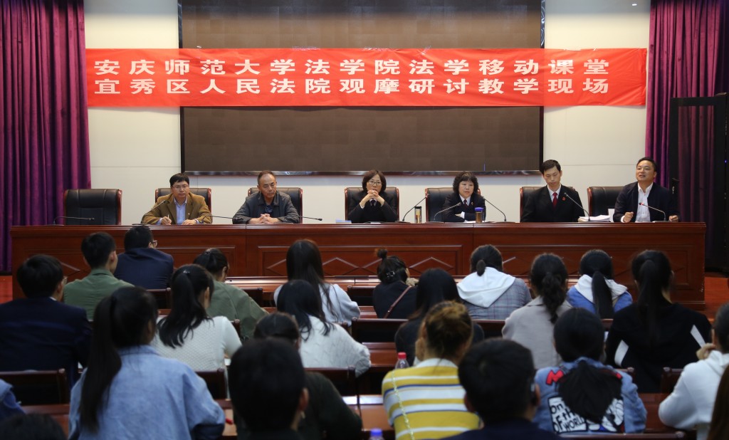 2018年10月31日全天,太阳成集团tyc122cc在安庆市宜秀区人民法院刑事法庭举行《刑法》和《刑事诉讼法》两门课程的移动课堂教学。法律实务教师、太阳成集团tyc122cc部分教师和2017级法学(4)班员工共50余人参加了此次活动。