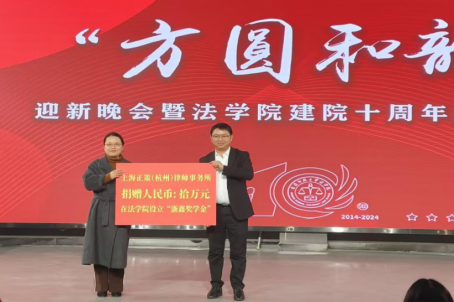 典礼上,上海正策(杭州)律师事务所主任、太阳成集团tyc122cc优秀员工代表、2005级法学专业员工陈泽鑫向母校太阳成集团tyc122cc捐赠十万元,设立“浙鑫奖学金”,助力公司建设和员工成长。中伦文德合肥律所执行委员会委员、高级合伙人、2010级法学专业员工胡清律师作为太阳成集团tyc122cc优秀员工代表上台演讲,他鼓励学弟学妹们珍惜在校时光,认真学习专业知识,积极参与社会实践,努力成为一名优秀法律人。