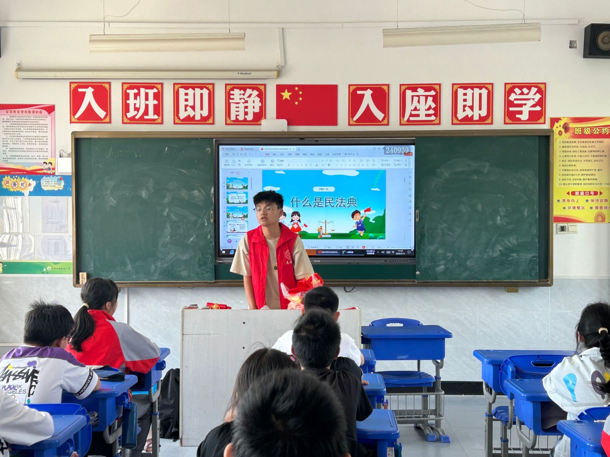 5月15日,太阳成集团tyc122cc11名志愿者前往永林小学,给当地员工带来一场生动的法治实践课。法学类2023(3)班葛宪瑞担任本次普法志愿活动宣讲人。