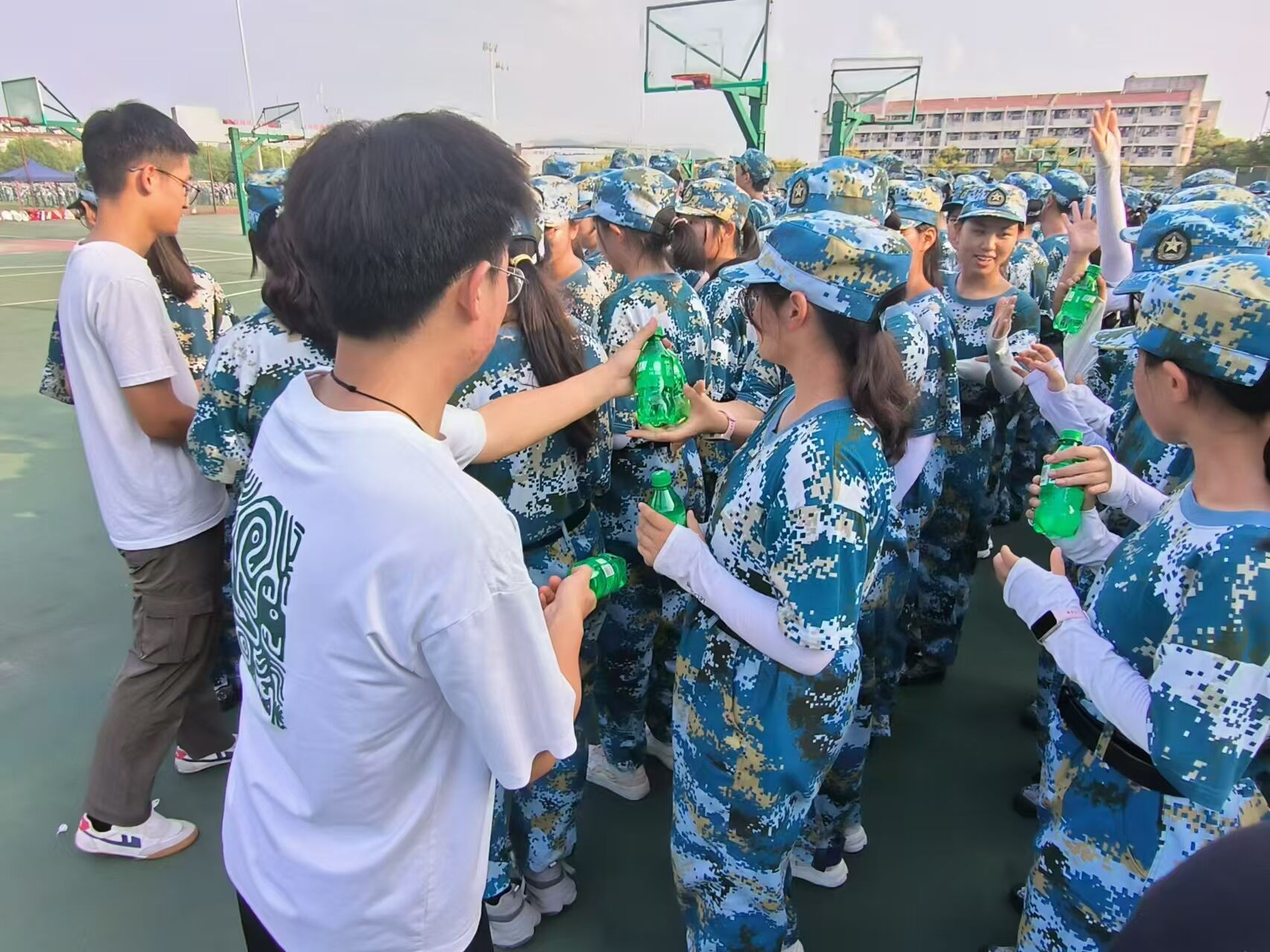 员工会成员们在老师们的带领下,为新生们带来了解暑饮品、清凉水果等精心准备的慰问品,让新生们在紧张的训练之余感受到了来自公司的关怀和温暖。