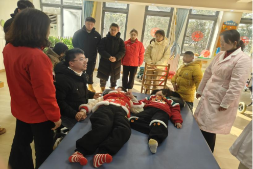 参观过程中,康复师储医生在康复室内在为一名患有脑瘫的儿童进行康复训练,康复师们耐心地指导着每一个孩子,根据他们的具体情况制定个性化的康复方案。看到康复师们的专注神情以及孩子们在康复训练中所展现出的坚韧意志,公司师生深受触动。在与康复师的交流中得知,近年来福利院不断探索创新复健模式,采取“康教医”一体化的治疗方式,以儿童存在的问题为导向,精准识别、精准评估、精准施案,综合评估儿童发育行为,制定适合不同孩子的康复计划。通过努力,许多孩子在身体功能和认知能力上都有了显著进步,部分孩子已经能够融入社会生活。