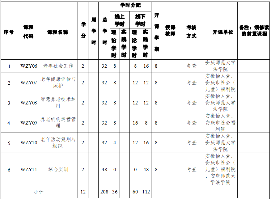 上课地点:122cc太阳成集团官网校内理论课堂+校外安徽怡人堂旗下养老机构、社区养老服务站、安庆市社会(儿童)福利院等实践基地。