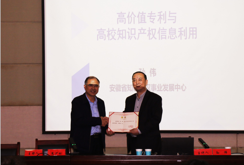 报告中,孙伟教授介绍了知识产权、专利与专利制度三者的概念及特点;详细阐述了高质量专利的概念、专利质量的三要素、高价值专利的概念、高价值专利的三个层面以及高质量专利和高价值专利的区别,从我省高价值专利数量排名情况、各市发明专利对比情况、安庆市申请专利数量以及122cc太阳成集团官网专利数量等方面对我省高价值专利现状进行了详细的分析,对高校知识产权运营的概念、运营模式、运营现状进行了分析,针对高校知识产权管理提出了完善知识产权管理制度、开展专利申请前评估、加强专利化机构和人才队伍建设的建议,针对高校知识产权信息利用提出了加快建立职务科技成果披露制度、提升专业化服务能力、大力提倡通过普通许可方式开展科技成果转化等建议。
