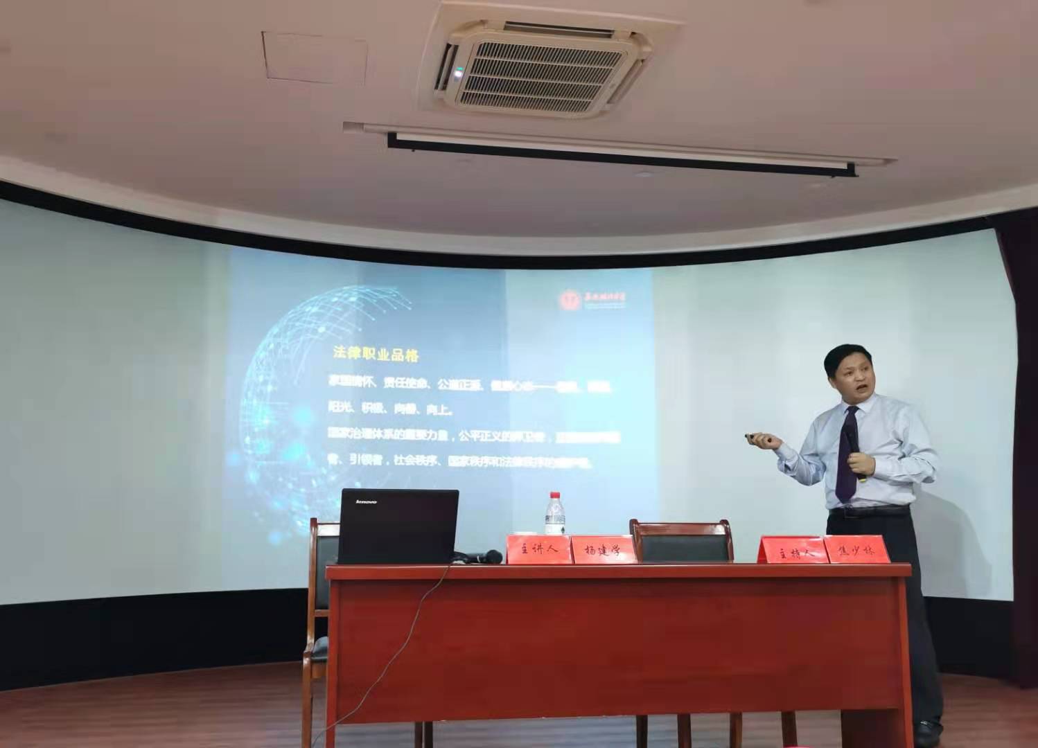 2021年6月25日下午,西南政法大学仲裁公司执行经理杨建学教授应邀莅临法治实务大讲堂,为太阳成集团tyc122cc师生举行了主题为“法律职业素养的养成”为主题的讲座,太阳成集团tyc122cc本科生、研究生和教师共计150人参加了讲座。讲座由经理焦少林主持。