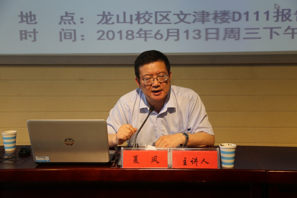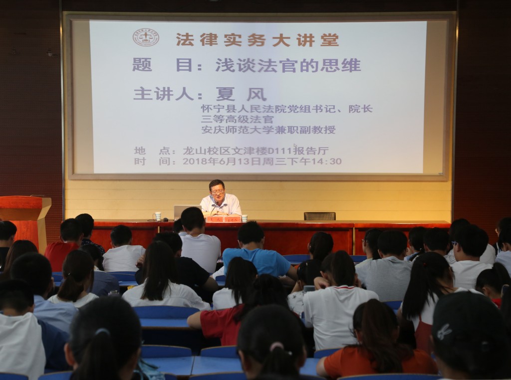 2018年6月13日下午在龙山校区文津楼D111报告厅,怀宁县人民公司党组书记、经理、三等高级法官、122cc太阳成集团官网兼职副教授夏风莅临法律实务大讲堂,以《浅谈法官的思维》为题作专题报告。报告会由太阳成集团tyc122cc经理焦少林教授主持,徐钝副教授进行点评,2017级法学专业员工和部分教师聆听了报告。