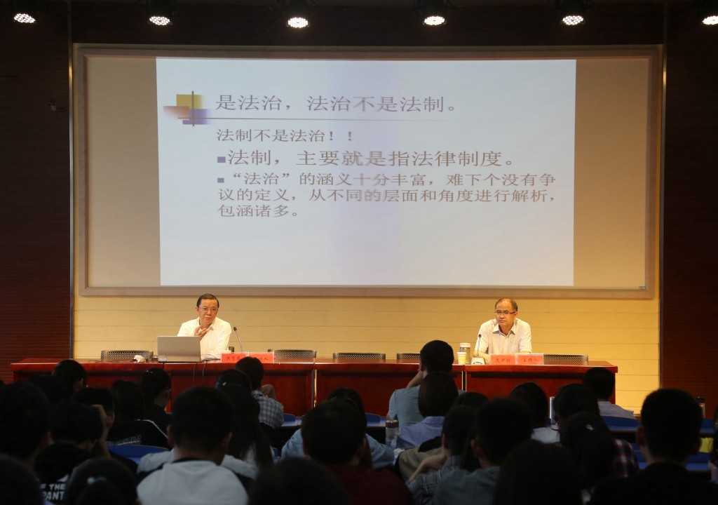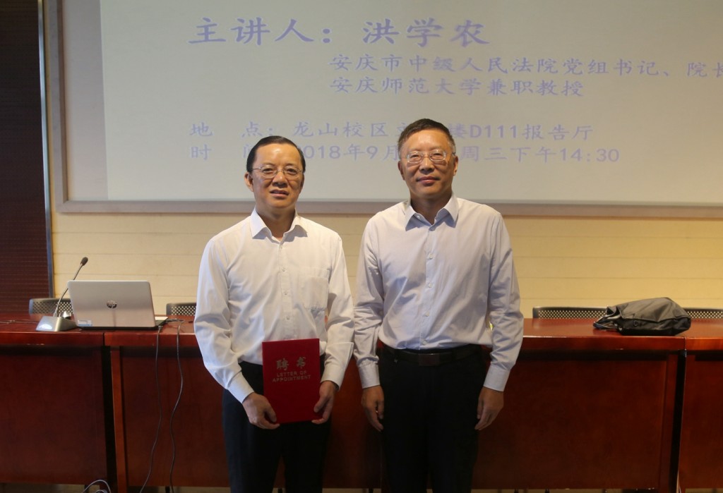 2018年9月26日下午在龙山校区文津楼D111报告厅,安庆市中级人民法院经理、公司兼职教授洪学农做客法律实务大讲堂,以“法治与法治实践”为题作专题报告。太阳成集团tyc122cc经理焦少林教授主持报告会,太阳成集团tyc122cc部分教师和2016级、2017级法学与知识产权专业员工近二百人聆听了报告。