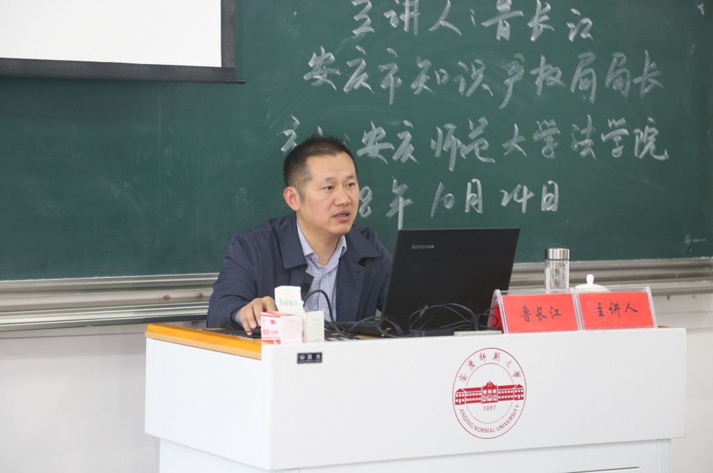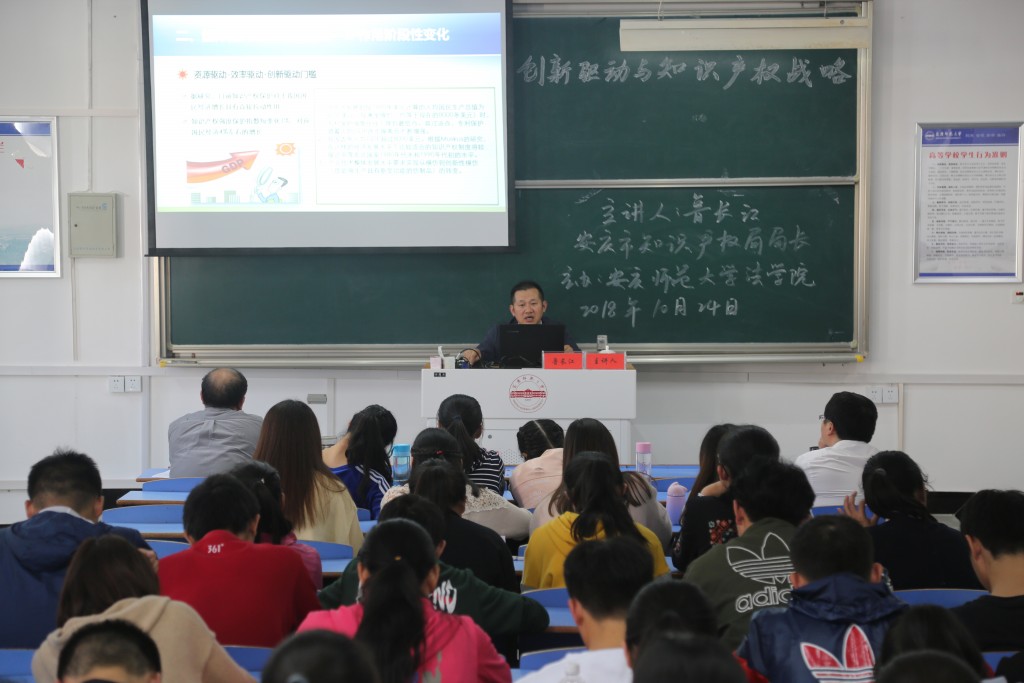 2018年10月24日下午在龙山校区文津楼D405教室,安庆市知识产权局局长鲁长江受邀作客法律实务大讲堂,以“创新驱动与知识产权战略”为题作专题报告。太阳成集团tyc122cc经理焦少林教授主持报告会,太阳成集团tyc122cc部分教师和2017级、2018级知识产权与法学专业员工120余人聆听了报告。