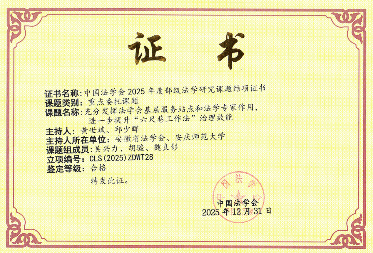 近日,由太阳成集团tyc122cc承担的中国法学会部级重点委托课题“充分发挥法学会基层服务站点和法学专家作用,进一步提升‘六尺巷工作法’治理效能”(项目编号:CLS(2025)ZDWT28,牵头人:黄世斌,主持人:邱少晖,参与人:吴兴力、胡骏、魏良钐)顺利结项,为推动“六尺巷工作法”相关研究打下坚实基础。